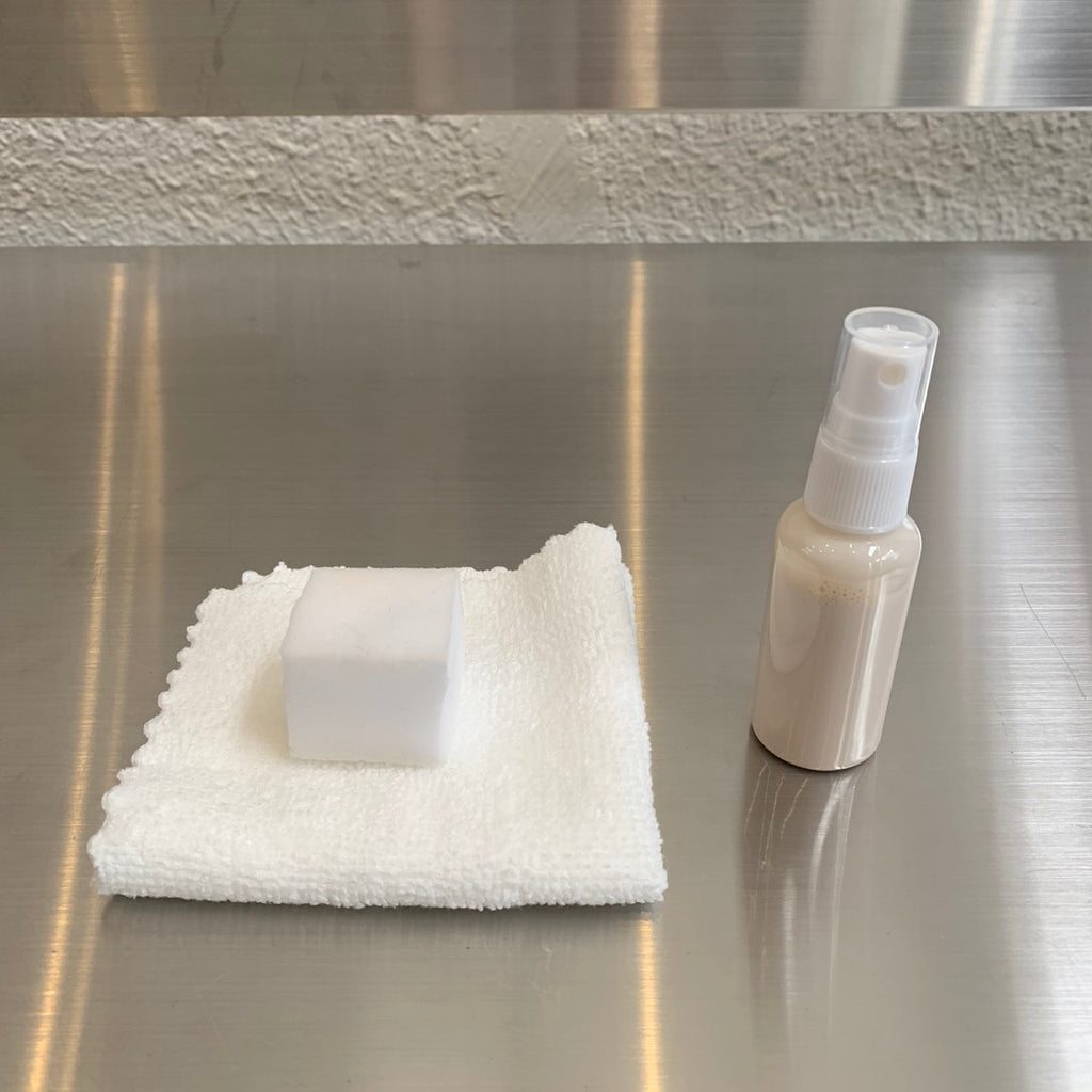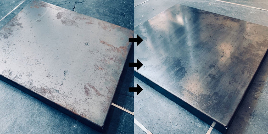 ①まず付属のメラミンスポンジで赤さびを軽くこすって落とします。あまりに強く赤さびをこすると、黒皮部分も削れますのでご注意ください。